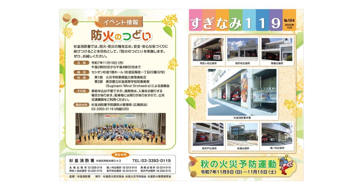 広報誌 2025 10/06 東京消防庁 杉並消防署「すぎなみ119 No.104」秋の広報誌(デザイン、DTP、印刷、等) デザイン等の制作業務及び印刷等を行わせていただきました。 制作実績 広報誌・会報誌 DTP PDF QRコード カラー サポート デザイン データ作成 パンフレット プランニング リーフレット 冊子 制作 協会 印刷 宅急便 官公庁 広報 広報誌 春の火災予防運動 杉並区 杉並消防署 東京消防庁 東京都 梱包 消防懇話会 消防署 港区 発送 秋の火災予防運動 編集 防火管理研究会 防火管理者研究会 防火管理者連絡協議会 広報誌 Tシャツ Others リーフレット(東京都委託事業) エコバッグ Tシャツ 広報誌 広報誌 広報誌 広報誌 シール