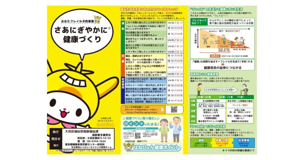 地方独立行政法人 東京都健康長寿医療センター 大田区 フレイル予防事業 三つ折りリーフレット(住民向け)制作(デザイン、データ作成、イラスト作成、等) フレイル予防事業リーフレットのデザイン等の制作業務を行わせていただきました。 -