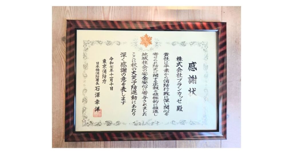消防行政に深い関心を寄せ、防火に関する広報を積極的に推進し 地域社会の安全安心に寄与したことについて、東京消防庁から感謝状をいただきました。 -